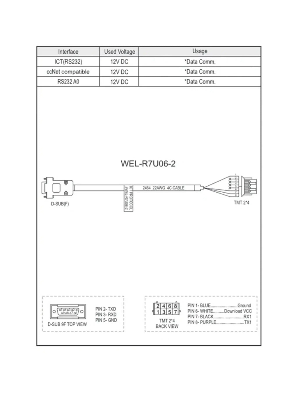 The ICT WEL-R7U06-2 is a 12V DC data-communication cable compatible with RS232, ccNet, and RS232 A0 interfaces, using a D-SUB 9F to TMT 2×4 connector layout.